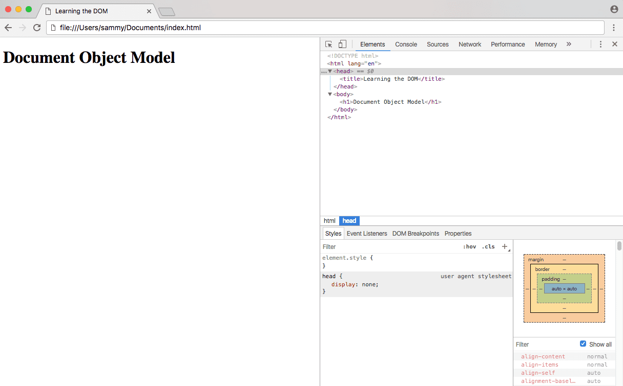 Mở index.htmlbằng trình duyệt bất kỳ, một trang web đơn giản với tiêu đề "Document Object Model" sẽ được hiển thị. Nhấp chuột phải vào bất kỳ đâu trên trang và chọn ""Inspect" (hoặc nhấn tổ hợp phím Ctrl+Shift+I). Thao tác này sẽ mở ra Developer Tools.