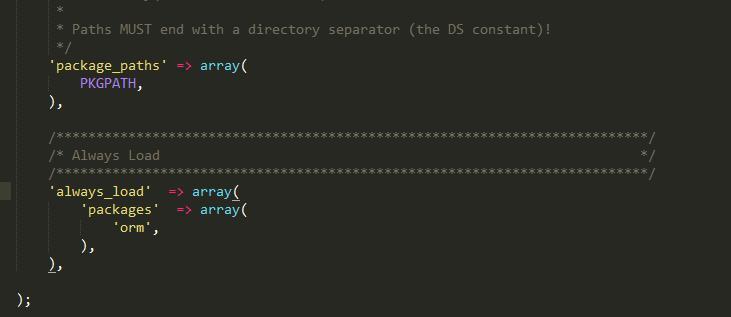 Các bạn vào sửa file config.php, trong fuel\app\config\config.php bỏ comment phần always_load và package orm ra, trông nó sẽ ntn: