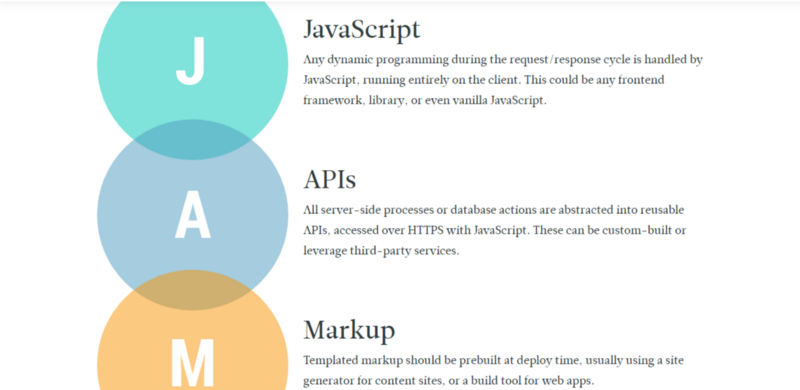 JAMstack không phải là các công nghệ cụ thể, nó là một kiến trúc phát triển web hiện đại dựa trên JavaScript phía client, các API có thể sử dụng lại và Markup dựng sẵn.