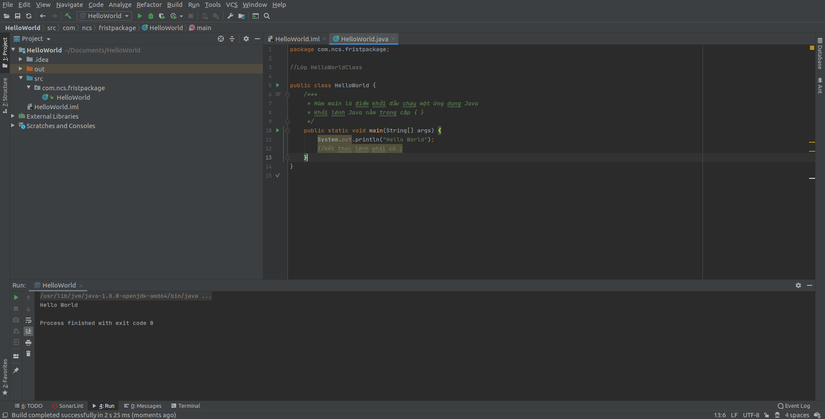Như vậy bạn đã có dự án đầu tiên HelloWorld,tiếp theo tạo package và class để viết những đoạn code đơn giản đầu tiên.