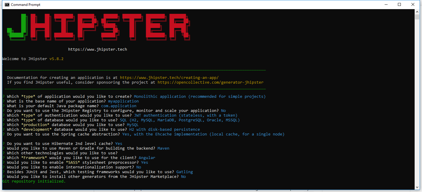 Với bước cài đặt JHipster ở trên nếu bạn muốn sử dụng phía Client với Angular JS thì bản JHipster của bạn phải là < 5. Khi đó bạn có thể chạy lệnh sau: