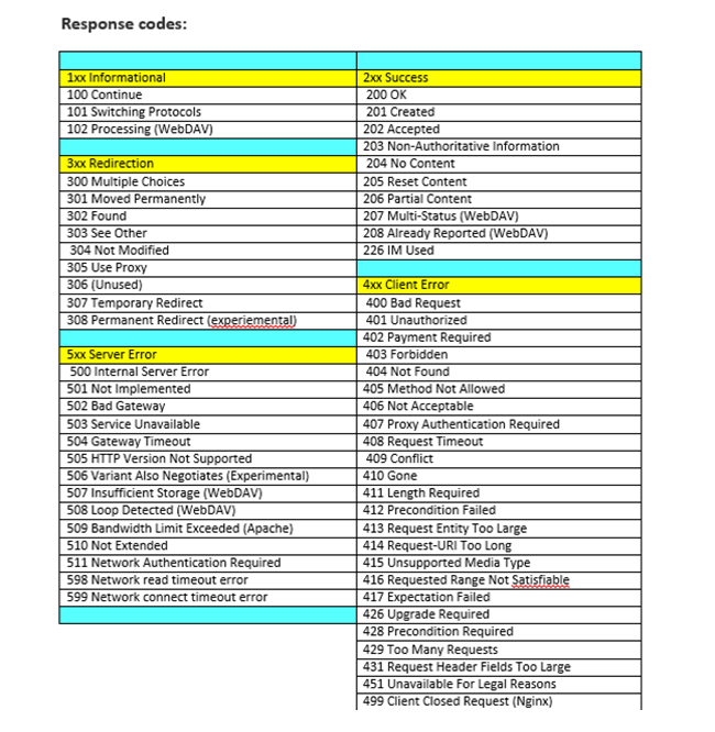Dưới đây là các response code khác nhau có thể gặp trong kiểm thử API.