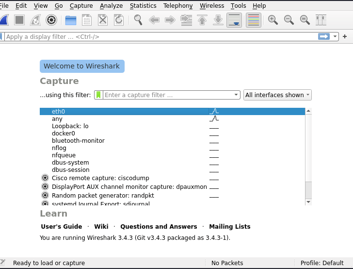 Giao diện đầu vào của Wireshark hiển thị 1 danh sách các interface để ta có thể lựa chọn và theo dõi: