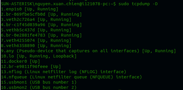 Hiển thị danh sách interface: tcpdump -D