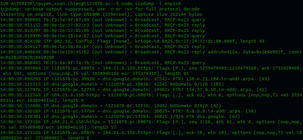 Bắt gói tin của mạng enp1s0: tcpdump -i enp1s0