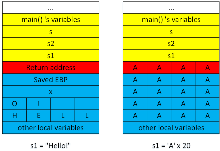 - Những dữ liệu khác nằm giữa vùng đệm và dữ liệu mục tiêu cũng bị ghi đè. Việc ghi đè đó có thể ảnh hưởng đến logic làm việc của chương trình, đến khả năng thành công của việc khai thác.