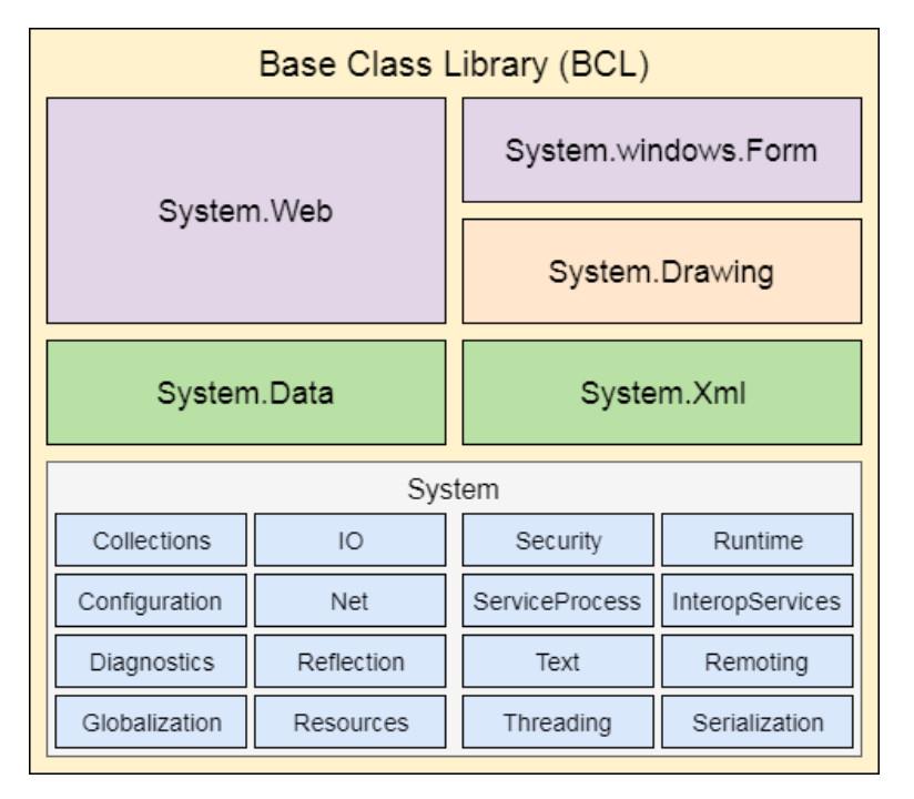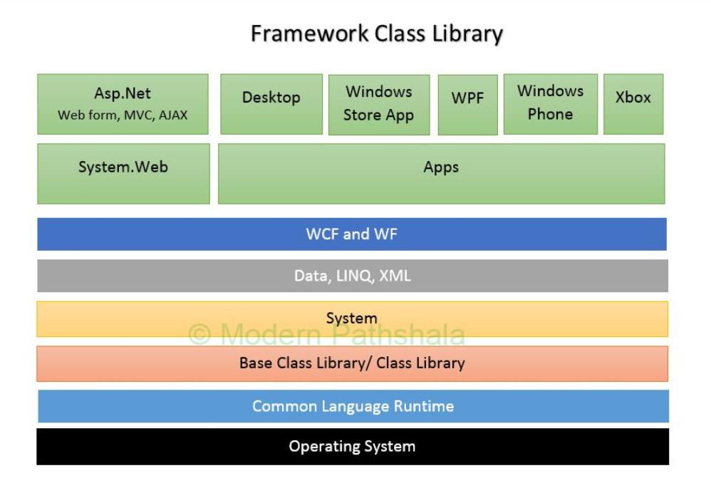 - Class Library: FCL là một tập hợp các class, namespace, interface và các kiểu dữ liệu (string, number...) được sử dụng để xây dựng nhiều chức năng và các loại ứng dụng khác nhau như ứng dụng web hay desktop... FCL này cũng được tích hợp với CLR của .NET Framework và được sử dụng bởi tất cả ngôn ngữ .NET như: C#, F#, Visual Basic .NET, etc. Ngoài ra nó cũng bao gồm các api cho việc đọc, viết file, kết nối databse, etc. BCL (Base Class Library) là tập con (subnet) của FCL và cung cấp các chức năng cơ bản như: