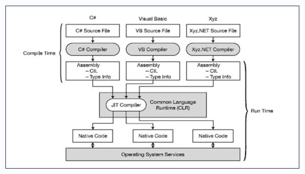 Biên dịch và thực thi trong .Net: Các ứng dụng viết bằng ngôn ngữ được hỗ trợ bởi .Net sẽ được trình trình biên dịch tương ứng chuyển đổi thành ngôn ngữ trung gian (Đươc gọi là MSIL(Microsoft Intermediate Language) hoặc CIL(Common Intermediate Language) hoặc IL(Intermediate Language)) cùng với metadata của nó (Chứa các thông tin về class, method, các trường dữ liệu, thông tin runtime, etc. ) và chúng được lưu trữ trong file assembly (.dll hoặc .exe), khi chạy ứng dụng .Net thì CLR nó lấy assembly và sử dụng trình biên dịch JIT để chuyển đổi assembly đó (Tức là chuyển đổi CIL) thành mã máy và sau đó CPU trên máy của bạn sẽ thực thi mã máy đó. Hình dưới đây thì "Compile Time" là quá trình "built", "Run time" là quá trình chạy (Quá trình này bắt đầu từ khi bạn khởi động ứng dụng của mình).