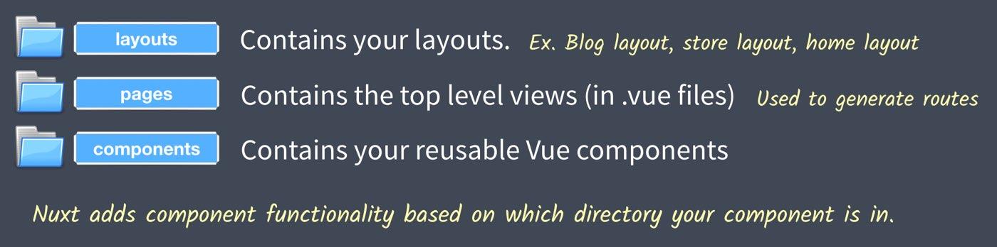 Chúng ta sẽ đặt hết cáccomponentstrong này chứ ? Nhưng đôi khi sẽ gây chút kiểm soát nhầm lẫn, ví dụ người dùng tạo 1 file để dành cho view, hay layouts, thì điều này trongnuxtjsđã phân chia khá rõ ràng
