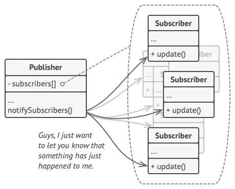 Đó là lý do tại sao điều quan trọng là tất cả các subscriber phải implement cùng một giao diện và publisher chỉ giao tiếp với các subscriber qua giao diện đó. Giao diện này nên khai báo phương thức thông báo cùng với một tập hợp các tham số mà publisher có thể sử dụng để chuyển một số dữ liệu theo ngữ cảnh cùng với thông báo.