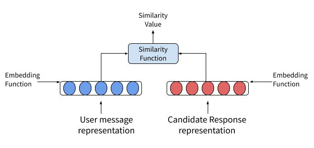 - Dùng một hàm tính mức độ tương đồng giữa embedding của user message và response tương ứng.
