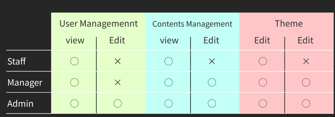 Ma trận trên đây mô tả các quyền của hệ thống như sau. Staff sẽ chỉ có quyền view tất cả resource trong hệ thống. Manager ngoài view thì có thể edit Content và Theme. Còn Admin sẽ có thể thay đổi tất cả resource trong hệ thống.