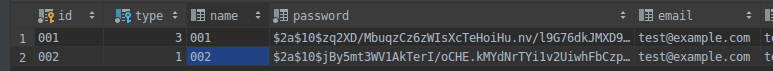 Mình set thông tin và role cho 2 user: 001 (admin) và 002 (staff)
