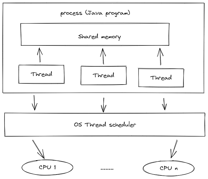 Hình trên mô tả một ví dụ về một process model. Một process duy nhất với 3 thread. Nó cũng cho ta thấy cách chúng có thể map với một số lượng n CPU tùy ý có sẵn trong hệ thống.