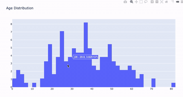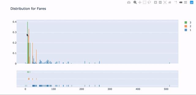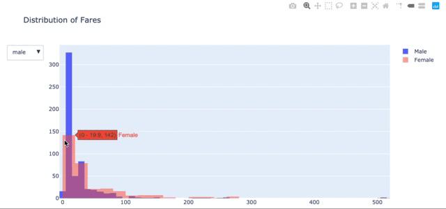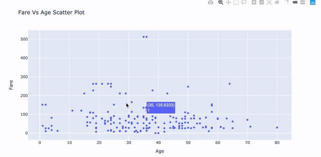 Ở đây đã được add thêm các tính năng để chúng ta có thể thao tác trực tiếp với hình vẽ như khi di chuột vài một điểm sẽ hiển thị giá trị của "Fare" và "Age" để mọi người có thể thấy chi tiết hơn. Dựa vào biểu đồ này chúng ta cũng thấy xu hướng giá tăng dưới 300 và những người già thường có xu hướng mua vé giá rẻ. Mọi người có thể vẽ thêm các biểu đồ để rõ hơn ví dụ như average age và giá cho Pclass.