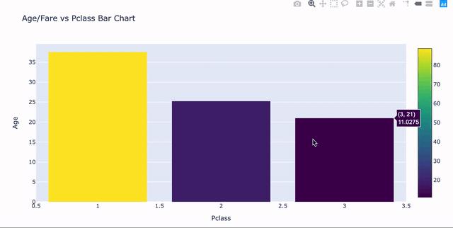 layout = go.Layout(title='Age/Fare vs Pclass Bar Chart',xaxis=dict(title='Pclass'),yaxis=dict(title='Age'),hovermode='closest')