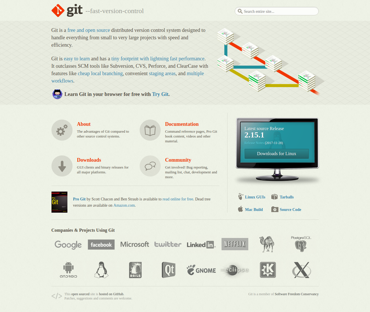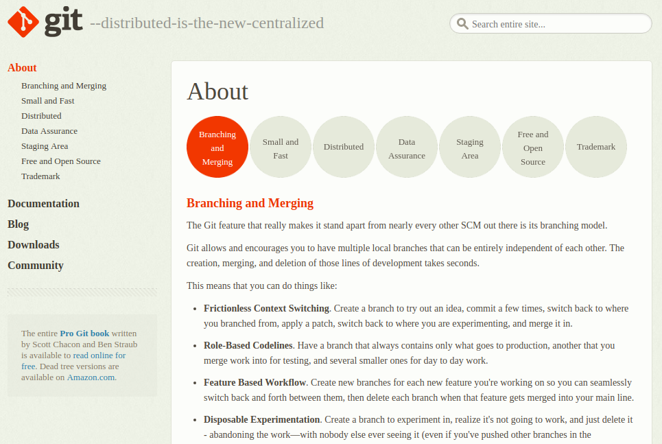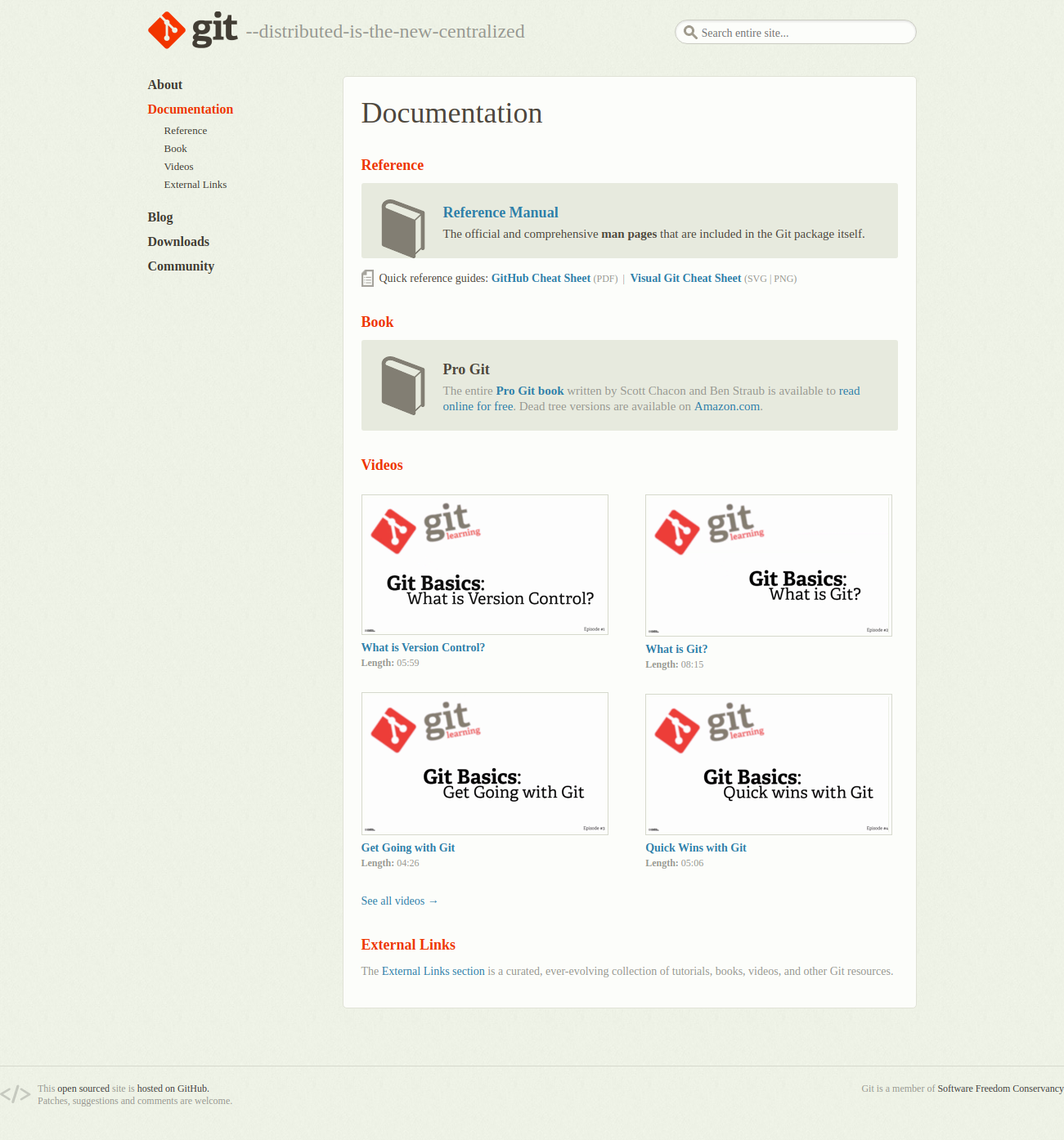 Hình ảnh bên dưới là trang documentation của Git, gồm 4 phần: