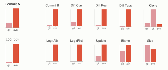 biểu đồđể so sánh Git với SVN, gọi là có chút số liệu để tăng tính thuyết phục (cột bé hơn thể hiện là nhanh hơn)