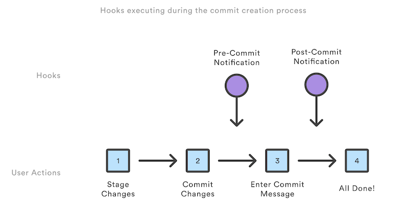 Git hooks dựa trên sự kiện, vì vậy, miễn là chúng ta thực hiện lệnh git trong luồng phát triển, git sẽ kiểm tra các thư mục hooks để tìm xem có script liên quan nào để chạy hay không. Một số script sẽ chạy trước hoặc sau các hành động của luồng phát triển này.