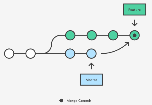 Với cách làm này, một commit merge mới sẽ xuất hiện ở lịch sử commit của nhánh feature, giống như một mối nối để ghép lại lịch sử của cả 2 nhánh. Bạn sẽ có một cấu trúc commit trông giống như này: