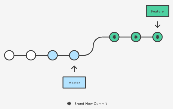 Thao tác này sẽ đưa toàn bộ những commit mới tạo ở nhánh feature nối tiếp vào "ngọn" của nhánh master, nhưng thay vì sử dụng một commit merge , nó sẽ viết lại lịch sử của project bằng cách tạo ra những commit mới ứng với mỗi commit ban đầu của nhánh feature. Lợi ích chính của việc rebase là bạn sẽ nhận được một lịch sử commit rõ ràng, dễ theo dõi hơn