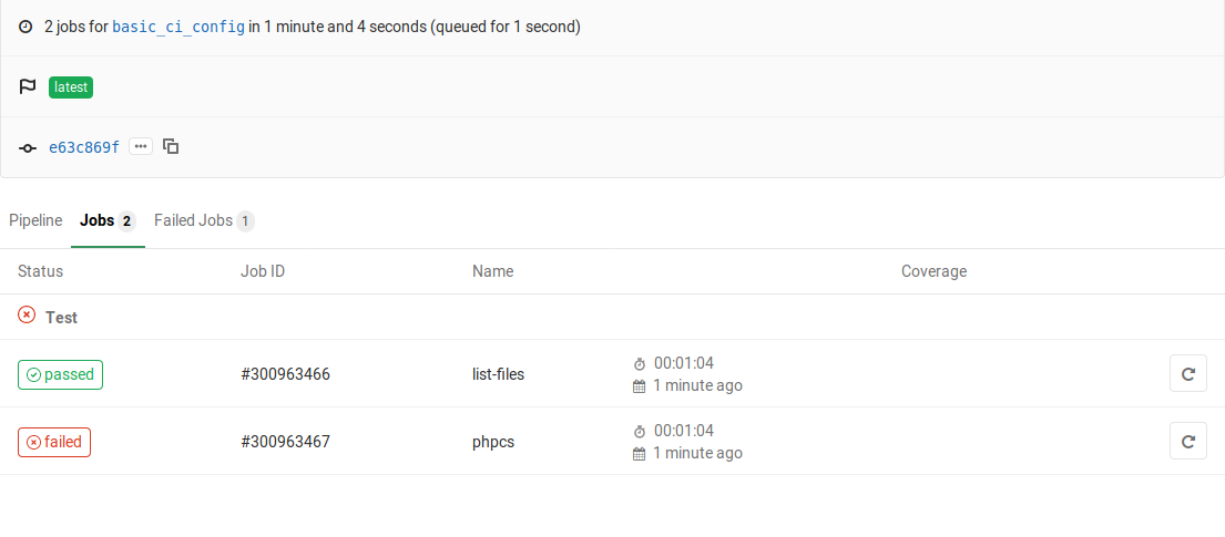 Chẳng hạn với Laravel (PHP) chúng ta thường chạy các Static Code Analyse Tools như phpcs, phpmd, phpcpd, phpmetrics, phpstan và unit test phpunit. Ở đây chúng ta focus vào 2 tools là phpcs và phpunit, để chạy được phpunit thì chúng ta cần phải cài composer dependencies, nếu có integration test thì cần phải chạy npm nữa, còn phpcs thì không. Do đó ở đây chúng ta sẽ define ra 2 job riêng biệt. Update ci config như sau: