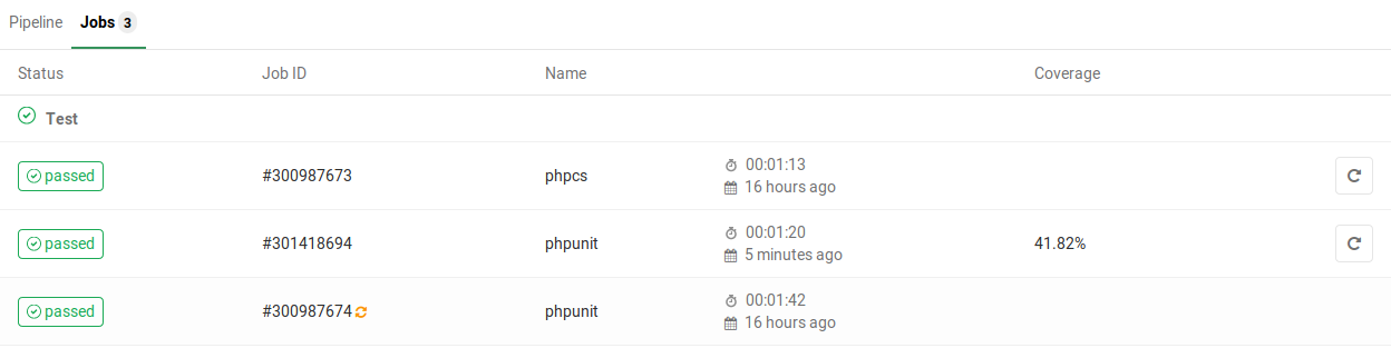 Khi chạy job phpunit, Gitlab CI sẽ parse output để lấy ra coverage % (dòng Lines: 41.82% (23/55)):