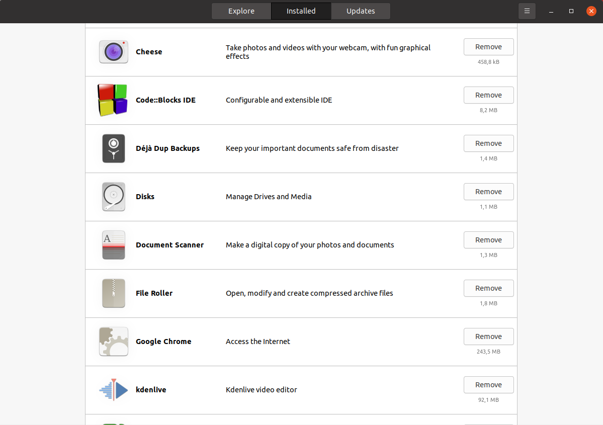 Không phải ứng dụng nào cũng có thể gỡ cài đặt bằng trung tâm phần mềm. Thường thì các ứng dụng UI hoặc là các ứng dụng được cài từ trung tâm phần mềm mới có thể gỡ cài đặt từ trung tâm phần mềm. Để gỡ cài đặt các ứng dụng này các bạn mở trung tâm phần mềm Ubuntu ( ubuntu Software) lên, vào phân Installed, tìm tới ứng dụng muốn xóa và chọn Remove.