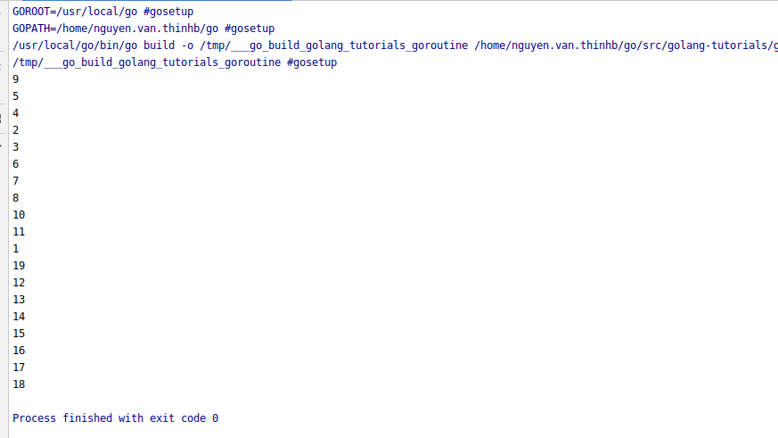 ví dụ trên có 2 hàm là g1() và g2() ta thêm từ khóa go đằng trước tên hàm để thể hiện đây là hàm goroutine, khi đó 2 hàm g1() và g2() sẽ được thực thi đồng thời mà không cần phải chờ hàm trước nó thức thi xong, ta thêm từ khóa go vào trước các câu lệnh fmt.Println(i) và fmt.Println(j)để cho chương trình biết các lệnh này cũng được thực thi đồng thời.
