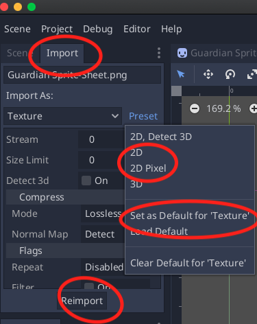 Chọn Import > Preset > 2D Pixel > Set as Default for texture > Reimport.