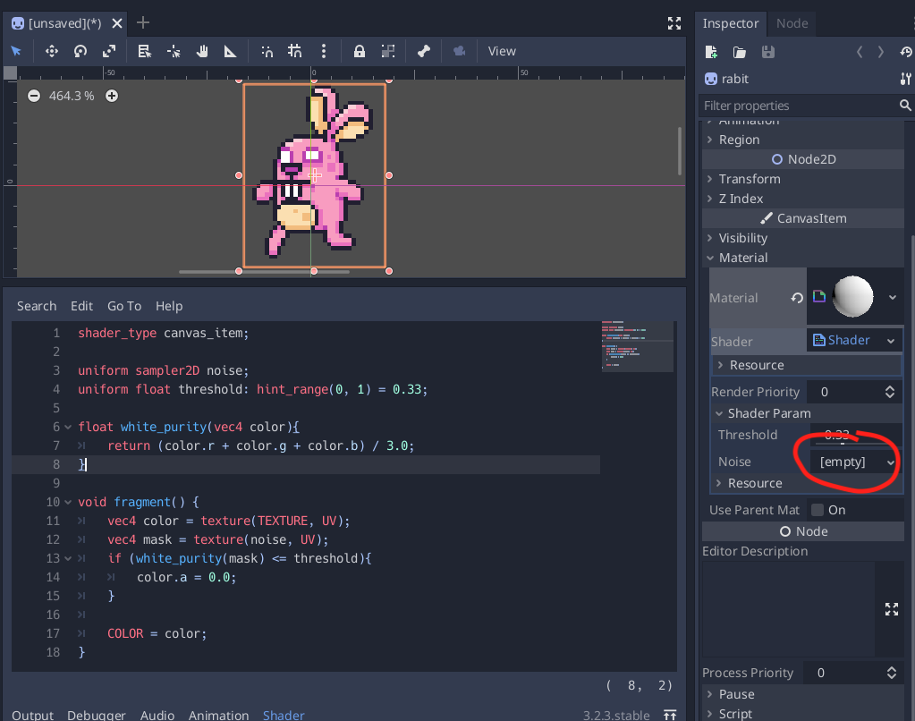 Bây giờ trong shader các bạn cũng làm tưong tự như vậy, các bạn sẽ chọn ra 1 ngưỡng để xoá hoặc vẽ là threshold, trước khi vẽ từng pixel con thỏ lên màn hình thì chúng ta sẽ kiểm tra lại tại vị trí vẽ pixel này thì giá trị noise của nó như thế nào, nếu lơn hơn threshold thì sẽ vẽ, không thì ngược lại. Ý tưởng chỉ đơn giản như vậy thôi ^^.