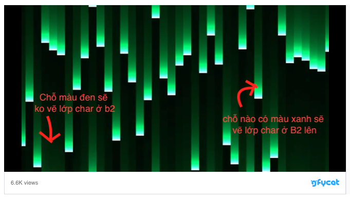 Phần 3: combine chúng lại, ý tuởng là layer rain ở phần 1 sẽ giống như 1 chiếc mặt nạ, các bạn có thể hình dung như thế này, tại cùng 1 thời điểm, chúng ta sẽ vẽ cả 2 layer này lên, layer rain ở truớc và layer char ở phía sau, chỗ nào mà lớp rain có màu xanh thì sẽ cho phép tháy đuợc layer char, còn chỗ nào bị đen thì sẽ che đi, ngưọc lại thì ko.