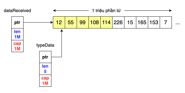 Sau đó, chúng ta tạo thêm 1 slice typeData từ slice dataReceived bằng phương pháp slicing. Khi sử dụng phương pháp slicing thì thay vì tạo ra một underlying array mới thì Go sẽ trỏ pointer vào underlying array có sẵn đó như hình dưới đây. Khi đó, typeData của chúng ta mặc dù chỉ có 5 phần tử nhưng capacity của nó là 1M phần tử.