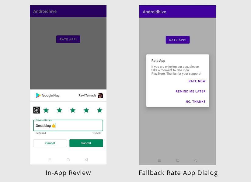 - In-app review API chỉ hoạt động trên các thiết bị từ Android 5.0 (API 21) trở lên hoặc cài đặt Chrome OS và có cài đặt Google Play Store.