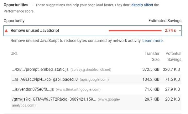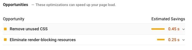Ở phần Opportunities, PSI đưa ra những đề xuất về những chỉ số hiệu suất để cải thiện thời gian tải. Mỗi đề xuất sẽ cho thấy ước tính thời gian tải trang tiết kiệm được nếu gợi ý PSI đã triển khai.