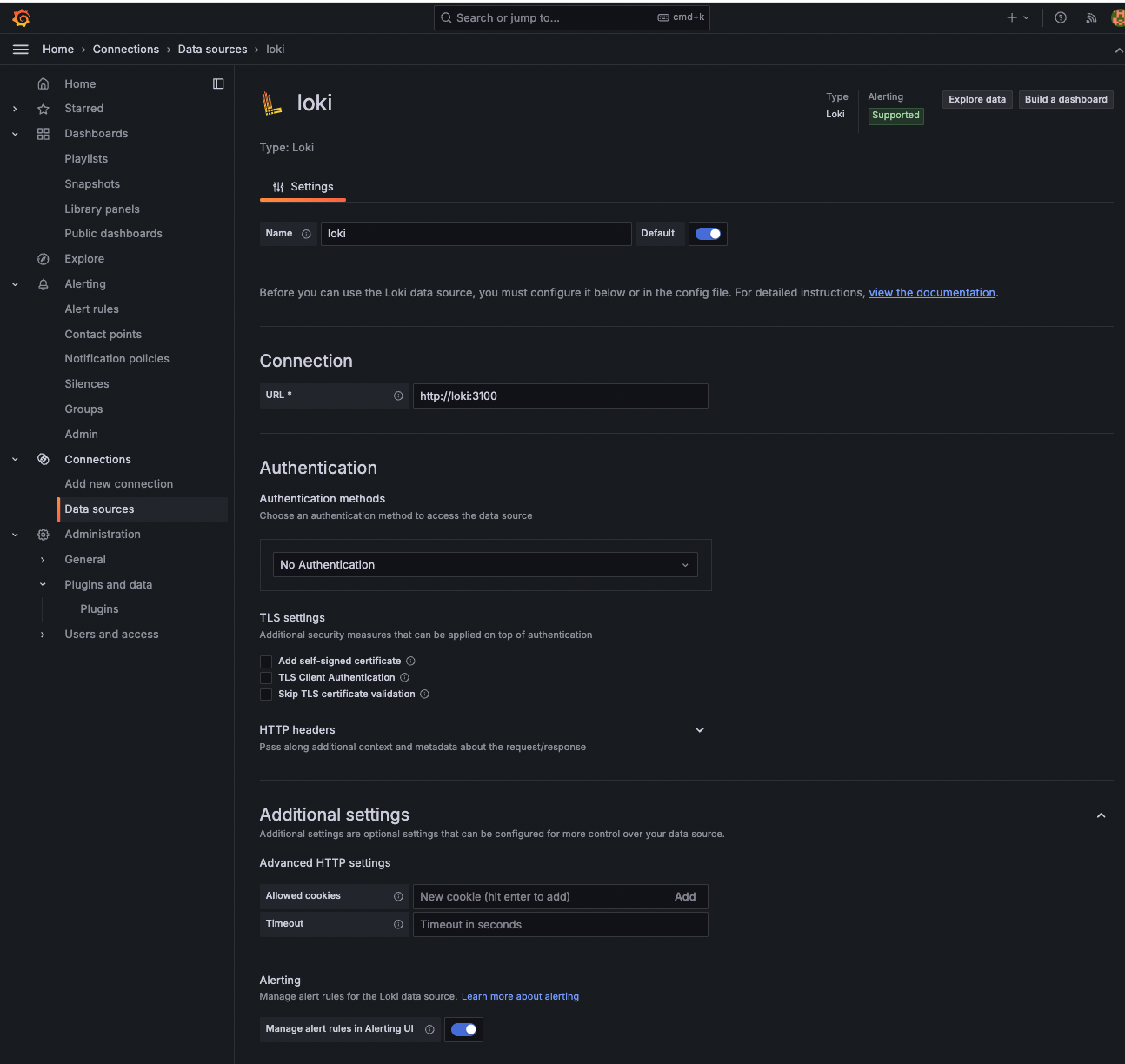 Như vậy là ta đã triển khai xong cả grafana dashboard, loki và promtail, giờ hãy truy cập vào dashboard http://{nodePortIP}:31005, sau đó tiến đến phần Connections -> Add new connection và thêm như sau và nhấn Save lại nhé