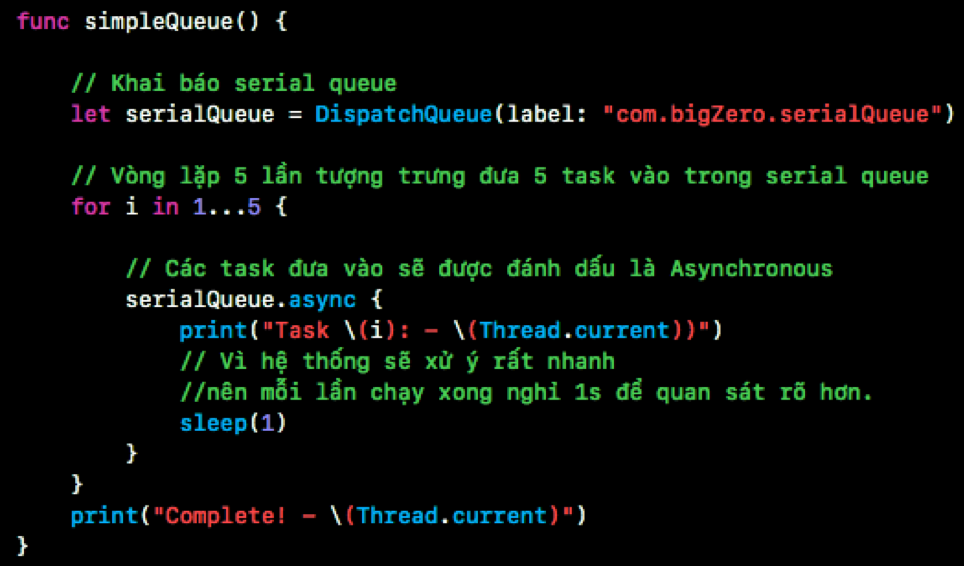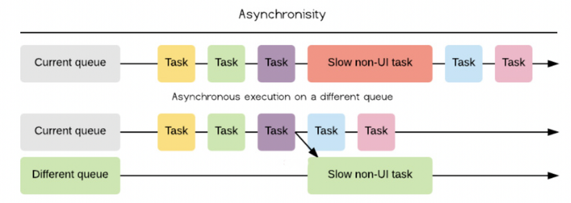 - Asynchronous: Nếu task được đánh dấu là Asynchronous(bất đồng bộ) thì task này được đẩy vào queue và ngay sau đó nó trả quyền điều khiển cho hàm gọi nó trong khi queue này đang thực thi một task.