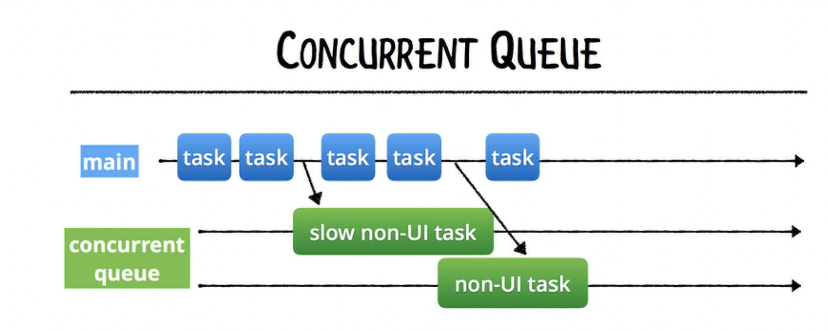 Là hàng đợi thực hiện đồng thời. Trong một thời điểm có thể có nhiều task được thực hiện cùng một lúc. Hệ thống sẽ tuỳ vào tải hiện thời của hệ thống và cấu hình phần cứng thực tế để khởi tạo và cấp phát các Threads để xử lý các tác vụ. Global queue là concurrent queue và có sẵn trong hệ thống.