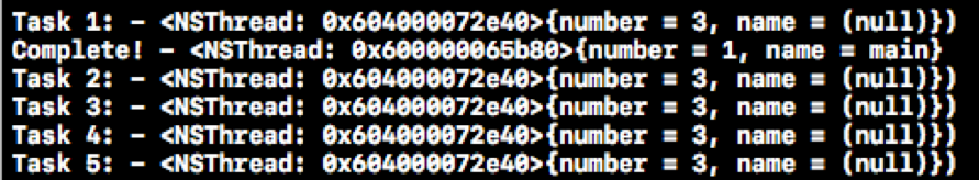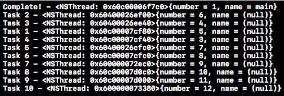 Kết quả concurrent queue tạo ra mười threads mỗi thread thực thi một task và không thằng nào chờ thằng nào.