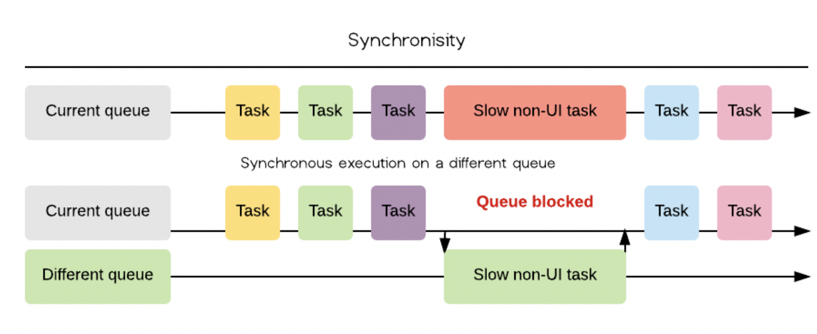 - Synchronous: Nếu task được đánh dấu là Synchronous(đồng bộ) thì về mặt cơ chế muốn đồng bộ dữ liệu sẽ phải lock các threads trong cùng queue với nó và trả quyền điều khiển cho main queue để thực thi task cần đồng bộ, sau khi task này được thực thi, nó sẽ unlock các threads và đẩy task mới vào.