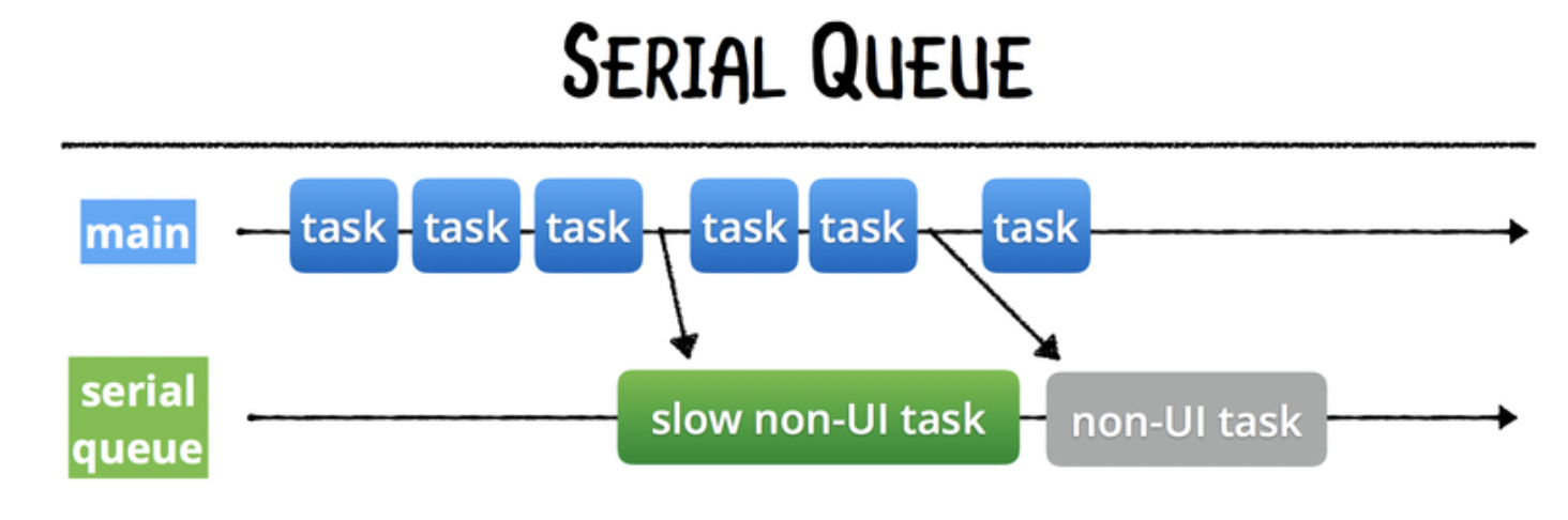 Main queue: là queue đặc biệt có sẵn trong hệ thống và là Serial queue, nó chạy những tasks trên main thread của ứng dụng. Được sử dụng để update UI của app, thực hiện những task liên quan đến update UIViews hay posting notifications. Bởi vì nó là serial queue nên chỉ có một task được chạy tại một thời điểm, do đó bạn sẽ bị block UI khi chạy những task nặng trên main queue (vd: download image từ server về). Mặc định hệ thống chỉ tạo duy nhất 1 queue này.