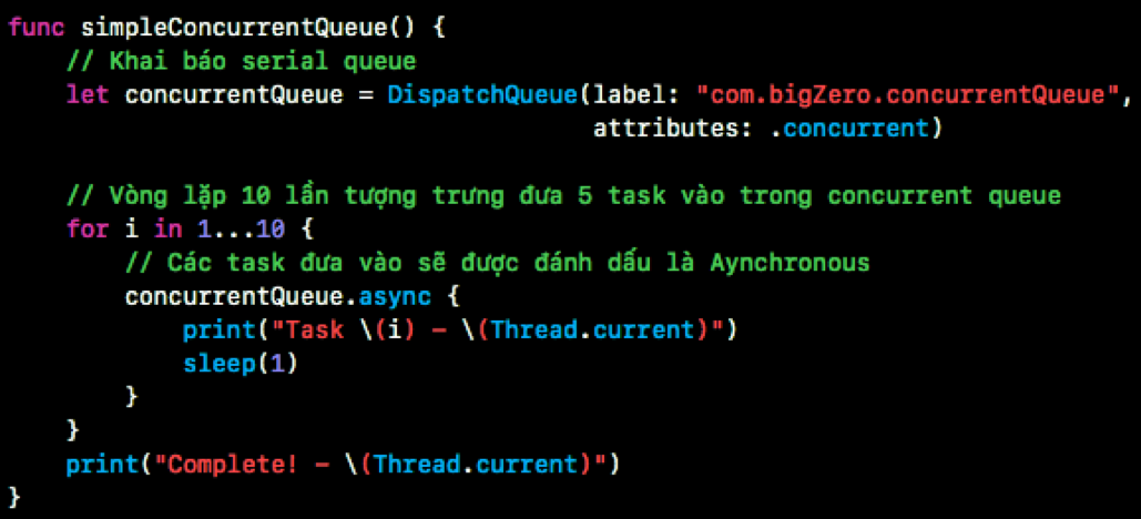 Ở ví dụ 10 tasks được đánh dấu là async được gửi vào trong concurrent queue. Queue này sẽ dựa vào tài nguyên hệ thống để tạo ra số threads để thực thi các tasks này.