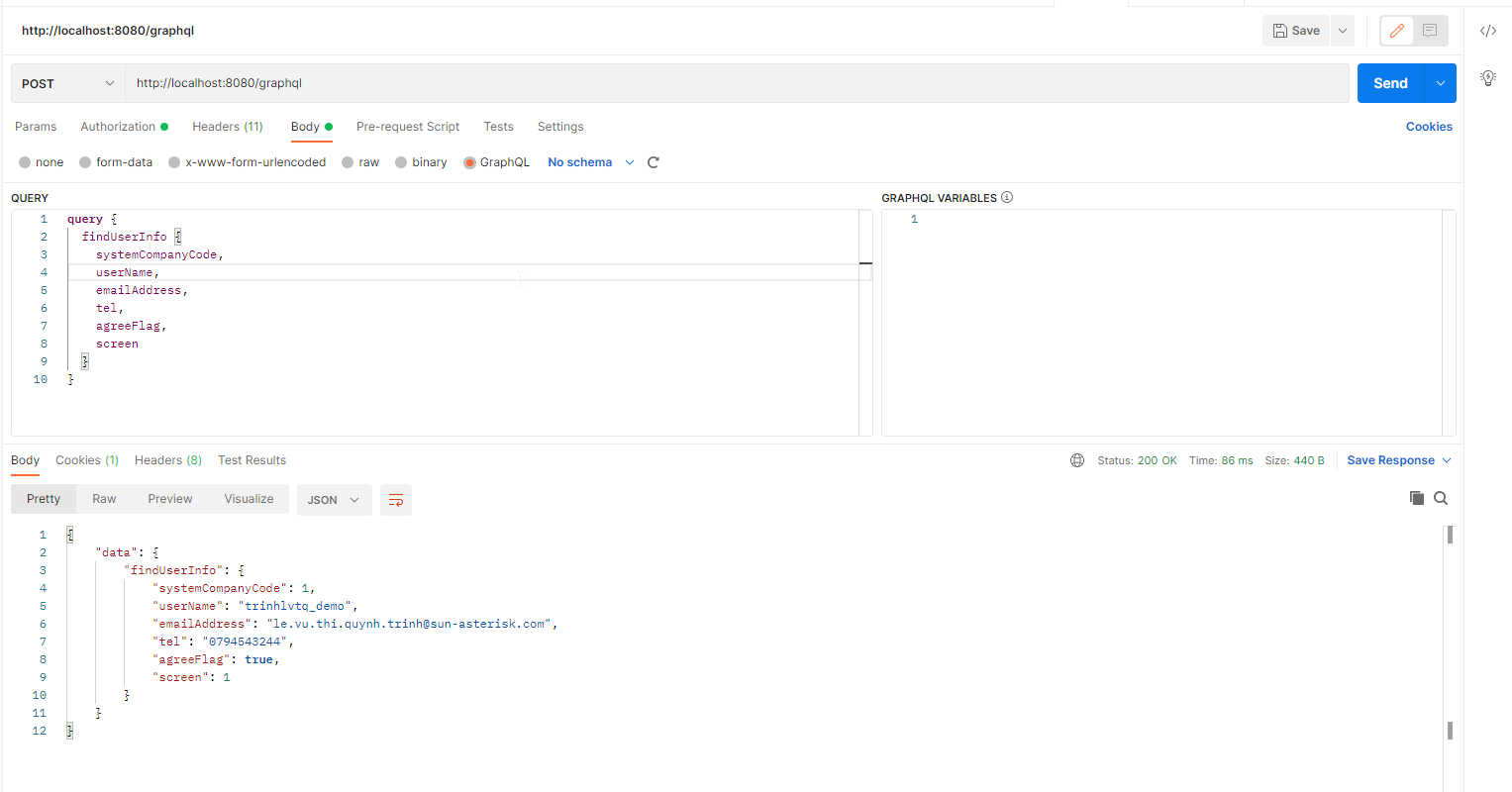 Còn đây là data mình gởi lên đầy đủ các field đã define trong schema user.graphqls