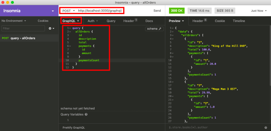 Mọi thứ hiện đã được thiết lập! Chúng ta có thể mở Insomnia và viết Truy vấn đầu tiên để lấy lại tất cả các Đơn hàng từ cơ sở dữ liệu.