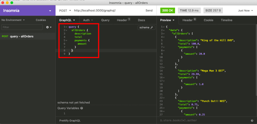 Ở trên cùng, chúng ta xác định yêu cầu là query {}, bên trong truy vấn, chúng ta gọi all_orders của QueryType thông qua allOrders {}. đừng quên chuyển từ snake-case to camel-case!