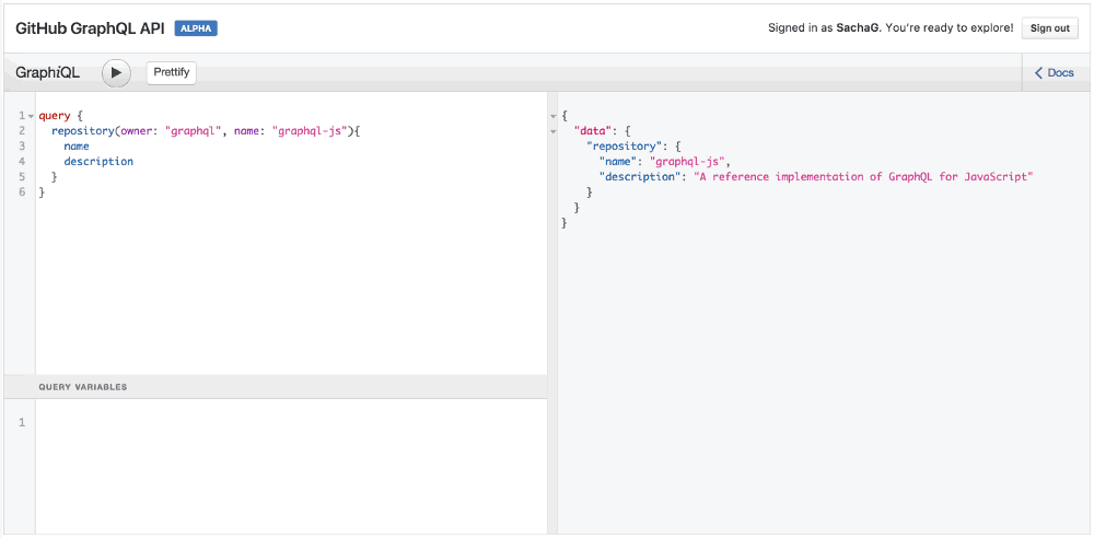 Một cách thực hành khá tốt là sử dụng GitHub’s GraphQLAPI Explorer. Hãy thử query sau: