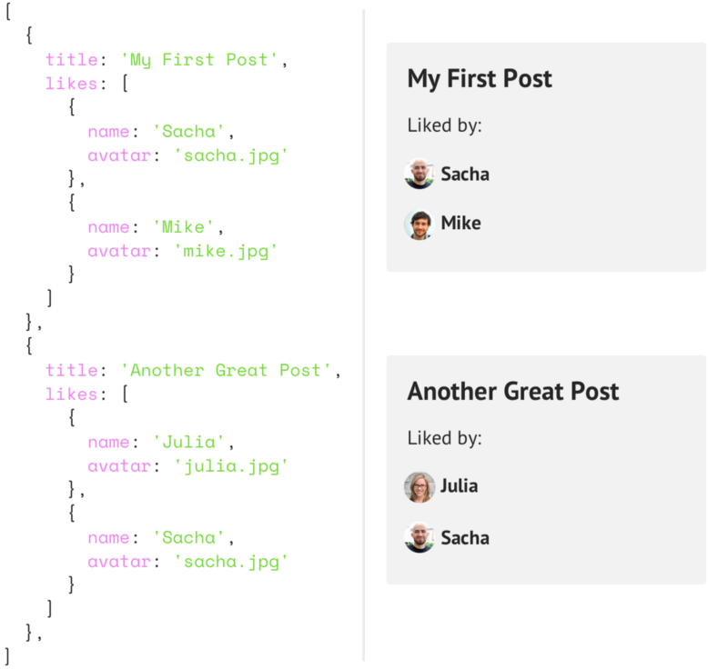 Thí dụ bạn muốn hiển thị một list posts, và ở dưới mỗi post là một list like, bao gồm cả tên người dùng và avatar. Cách giải quyết đơn giản là thay đổi API của ‘posts’ để nó bao gồm ‘a like array' chứa thông tin về người dùng.