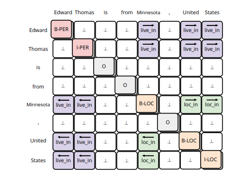 Ma trận trên là output của model. Trong đó, diagonal entries thể hiện xem từng tokens có phải là entities không. Entities tagging có được annotated dưới dạng BIOES ( Ví dụ: Edward Thomas is from Minesota, United States ; thì Edward: B-PER (bắt đầu tên một người), Thomas: E-PER (kết thúc tên một người), is: O (không thuộc entites), from : O; Minesota : S-Loc (Entity nơi chốn, chỉ gồm 1 từ)). Các cách tagging khác các bạn có thể tham khảo ở wiki.