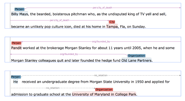 Ví dụ, The 1 Decembrie 1918 University is located in Alba Iulia, Romania. The capital of the country is Bucharest... được annotated là (is country of:Romania, Alba Iulia), (is capital of:Bucharest, Romania). Chú ý ở đây các entities không có mối quan hệ mà ta đang quan tâm sẽ không được annotated. Như vậy hard negative example trong ví dụ này sẽ được sample từ .