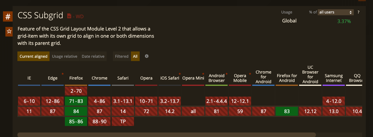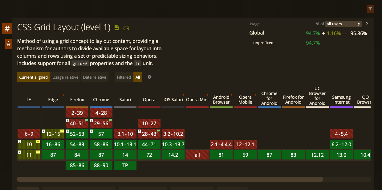 Grid được hỗ trợ bởi gần 96% bởi trình duyệt. Nó đã liên tục phát triển, bổ sung các tính năng như subgrid(*) - có thể chỉ có sẵn trong một tập hợp trình duyệt nhỏ. Bạn nên kiểm tra tất cả các tính năng của Grid mà bạn đang sử dụng để biết mức độ hỗ trợ của nó.